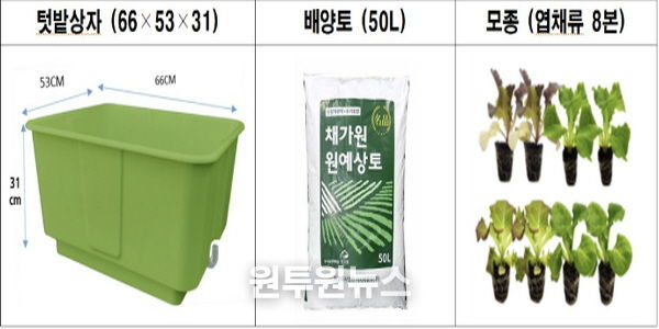 텃밭상자(66吱君cm), 배양토(50L), 모종(엽채류 8본), 사용설명서로 구성돼 있으며 서대문구 주민, 기관, 단체가 신청할 수 있다.