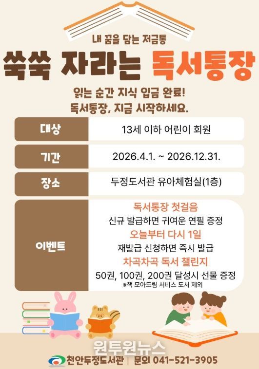 (원투원뉴스) 천안시 두정도서관은 내달부터 어린이들의 독서습관 형성을 위한‘쑥쑥 자라는 독서통장’프로그램을 운영한다고 18일 밝혔다.