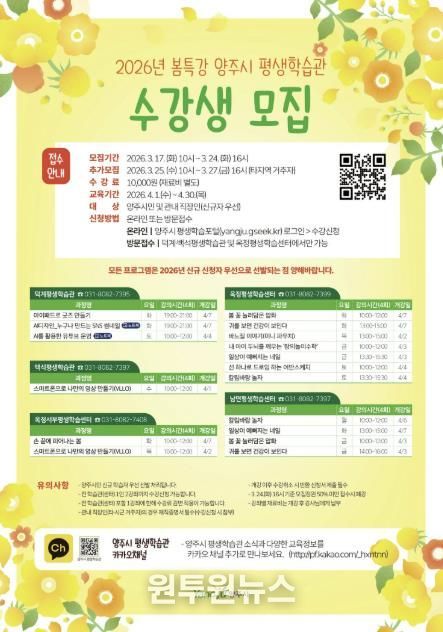 수강 신청은 오는 3월 24일 16시까지 가능하며, ‘양주시 평생학습포털’을 통한 온라인 신청 또는 덕계·백석 평생학습관 및 옥정 평생학습센터 방문 접수로 가능하다.