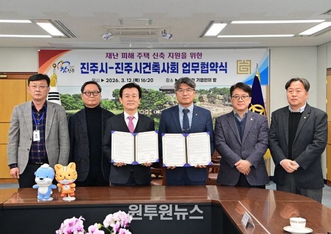 (원투원뉴스) 진주시는 재난으로 주택 피해를 본 시민들의 신속한 주거 안정과 일상 회복을 돕기 위해 진주시건축사회와 지난 12일 진주시청에서 '재난 피해 주택 신축 지원을 위한 업무협약(MOU)'을 체결했다.