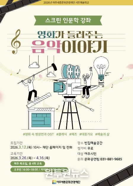 (원투원뉴스) 여주세종문화관광재단은 오는 26일부터 시민예술학교 프로그램의 일환으로 ‘스크린 인문학 강좌–영화가 들려주는 음악 이야기’를 운영한다.