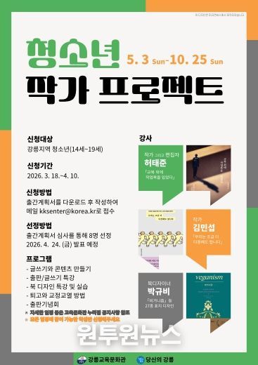 (원투원뉴스) 강릉교육문화관은 지역 작가와 함께 청소년이 한 권의 책을 기획하고 완성하는 전 과정을 경험할 수 있도록 ‘청소년 작가 프로젝트’를 운영한다.