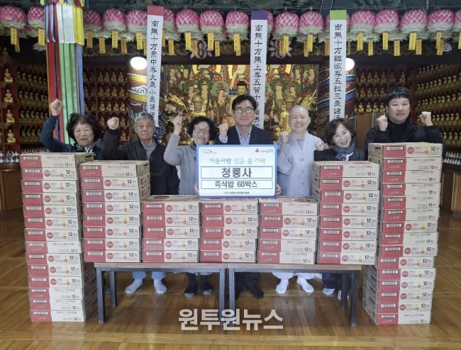 (원투원뉴스) 가평 청룡사는 최근 지역의 소외된 이웃들에게 도움이 되길 바라는 마음으로 청평면 행정복지센터에 즉석밥 60박스를 기탁했다.