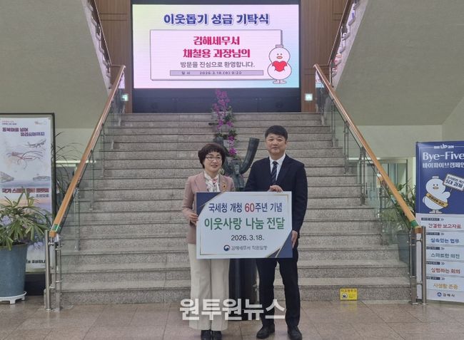 김종진 김해세무서장은 “국세청 개청 60주년을 맞아 성금을 기탁하게 됐다”며 “국민과 함께하는 따뜻한 세정을 실천하고 지역사회 공헌활동도 꾸준히 이어가겠다”고 말했다.