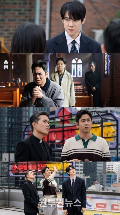 마지막으로 공개된 스틸컷은 신이랑과 윤봉수, 그리고 신부 마태오의 옥천빌딩 옥상 회동을 보여준다. 지난 방송에서 옥상은 신이랑이 억울한 죽음의 한을 풀어준 망자 이강풍(허성태)을 마지막으로 배웅했던 장소로, ‘신이랑 법률사무소’ 세계관에서 중요한 의미를 지닌 공간이다. 이로써 귀신을 보는 변호사 신이랑, 귀신을 무서워하는 매형 윤봉수, 그리고 전 무속인 출신의 신부 마태오까지. 전혀 어울릴 것 같지 않은 세 사람이 ‘신이랑즈’로 힘을 합치게 될 전망이다.