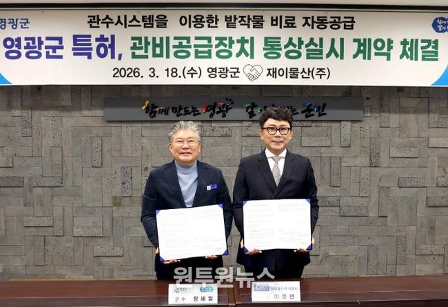 (원투원뉴스) 영광군은 지난 18일 전북 군산시에 위치한 재이물산(주)과 ‘관비공급장치’ 특허에 대한 통상실시권 계약을 체결했다고 밝혔다.