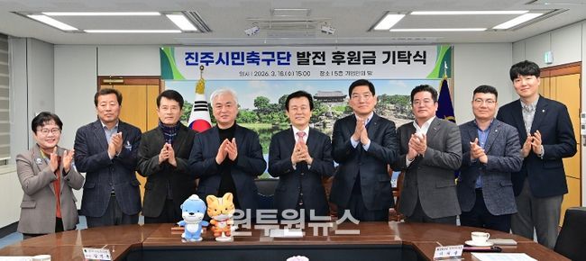 (원투원뉴스) 진주시는 18일 진주시청 기업인의 방에서 NH농협 진주시지부와 경남은행의 ‘진주시민축구단 발전을 위한 후원금 전달식’을 개최했다고 밝혔다.