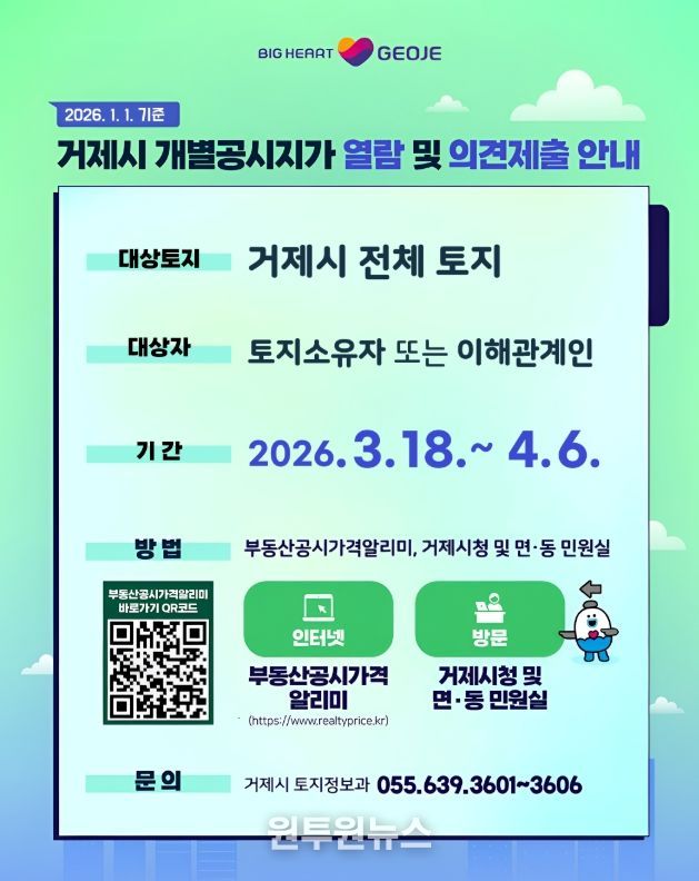 (원투원뉴스) 거제시는 2026년 1월 1일 기준 개별공시지가(안)에 대하여 3월 18일부터 4월 6일까지 열람 및 의견을 접수한다고 밝혔다.