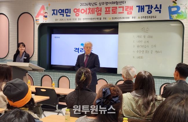 (원투원뉴스) 경상북도 성주교육지원청 산하 성주영어체험센터는 지역민의 영어 의사소통 능력 향상과 평생학습 문화 확산을 위해 '2026학년도 지역민 영어 회화 프로그램' 개강식을 성주영어체험센터 메인홀에서 개최했다.