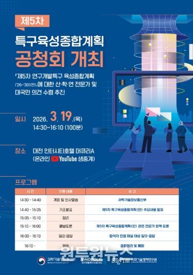 (원투원뉴스) 과학기술정보통신부는 2026년 3월 19일 14시 30분, 대전에서(인터시티호텔, 머큐리 A홀) 제5차 연구개발특구육성 종합계획 공청회를 개최한다.