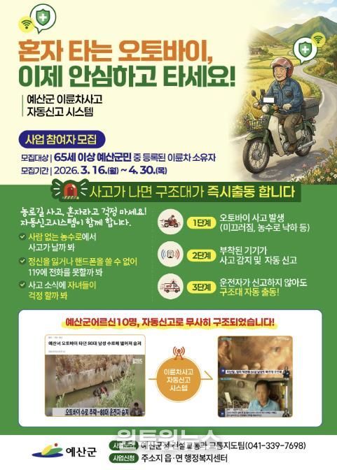(원투원뉴스) 예산군은 이륜차사고 발생 시 자동 신고를 통해 신속한 구조를 지원하는 ‘이륜차사고 자동신고 시스템 운영’ 사업을 추진한다.