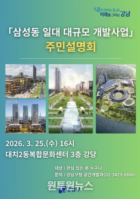 (원투원뉴스) 꿈이 모이는 도시, 미래를 그리는 강남구가 오는 3월 25일 오후 4시, 대치2동복합문화센터 3층 강당에서 ‘삼성동 일대 대규모 개발사업 주민설명회’를 개최한다.
