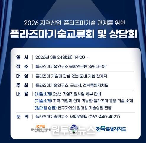 (원투원뉴스) 군산시는 오는 24일 전문 연구기관인 플라즈마기술연구소에서 도내 기업을 대상으로 ‘지역산업-플라즈마 기술 연계를 위한 기술교류회 및 상담회’를 개최한다고 18일 밝혔다.