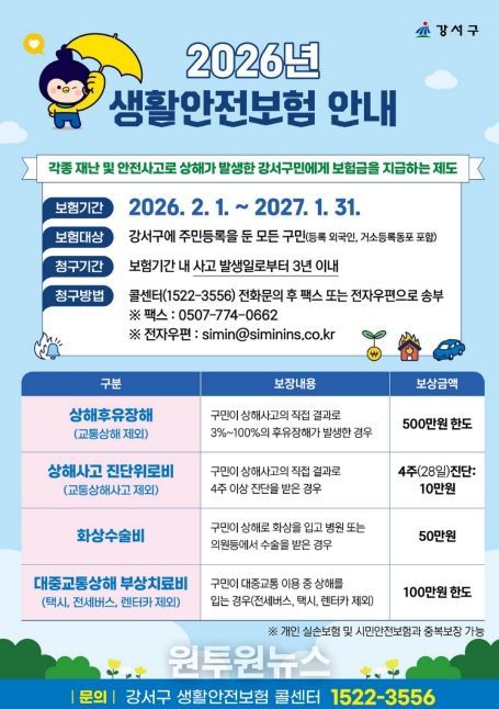(원투원뉴스) 서울 강서구는 일상생활 속 예기치 못한 사고로부터 구민을 보호하기 위해 '2026년 강서구민 생활안전보험'을 운영한다고 밝혔다.