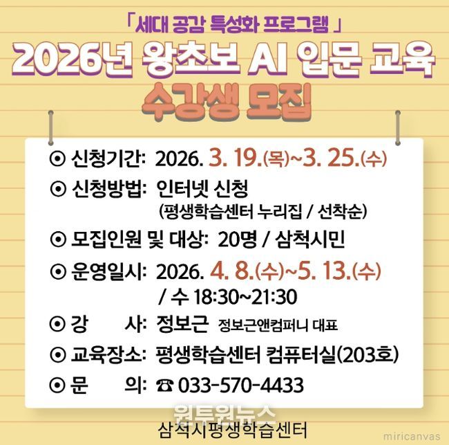 (원투원뉴스) 삼척시는 3월 19일부터 3월 25일까지 삼척시민을 대상으로 ‘2026년 왕초보 AI 입문 교육’ 수강생을 모집한다고 밝혔다.