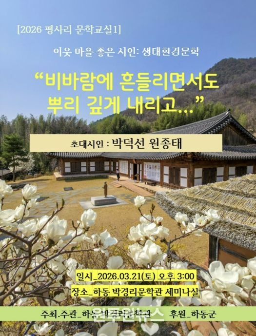 (원투원뉴스) 하동 박경리문학관이 오는 3월 21일 오후 3시, 문학관 내 세미나실에서 ‘2026 평사리문학교실1 : 이웃 마을 좋은 시인-생태환경문학’ 강연을 개최한다.