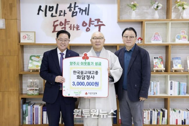 (원투원뉴스) 양주시는 지난 18일 시장실에서 한국불교태고종 화담정사로부터 이웃돕기 성금 300만 원을 기탁받았다고 밝혔다.