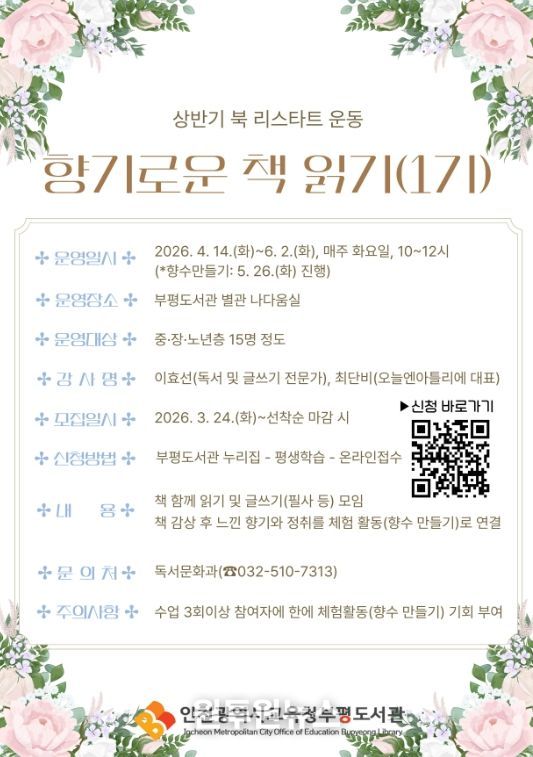 (원투원뉴스) 인천광역시교육청부평도서관은 중·장·노년층의 활기찬 독서 생활을 지원하는 ‘북 리스타트(Book Re-start) 운동’의 일환으로, 오는 24일부터 ‘향기로운 책 읽기’ 1기 참여자를 모집한다.