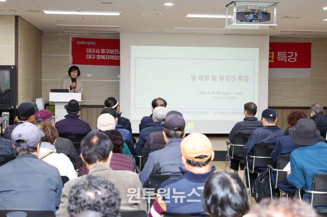 (원투원뉴스) 대구 중구보건소(소장 황석선)는 ‘제19회 암 예방의 날(3월 21일)’을 맞아 지난 19일 중구 노인복지관에서 대구경북지역암센터와 함께 어르신 120명을 대상으로 암 예방 및 암 검진 특강을 개최했다.