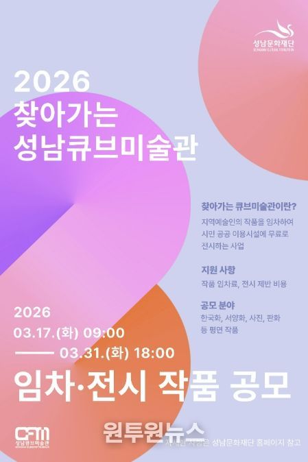 (원투원뉴스) 성남문화재단은 지역예술인의 창작 환경 지원을 다각화하고 시민들의 문화예술 향유기회를 확대하고자 ‘2026 찾아가는 성남큐브미술관’ 작품 임차 공모를 진행한다.