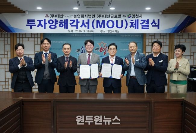 (원투원뉴스) 영천시는 19일 시청 영상회의실에서 ㈜태산과 농업회사법인 ㈜태산글로벌과 220억원 규모의 투자협약(MOU)을 체결했다.