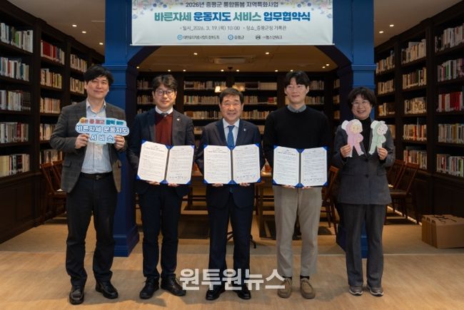 (원투원뉴스) 충북 증평군은 19일 군청 기록관에서 대한물리치료사협회 충북도회(회장 정강훈), ㈜헬스앤워크(대표 강철진)와 통합돌봄 지역특화사업 ‘바른자세 운동지도 서비스’ 추진을 위한 업무협약을 체결했다.
