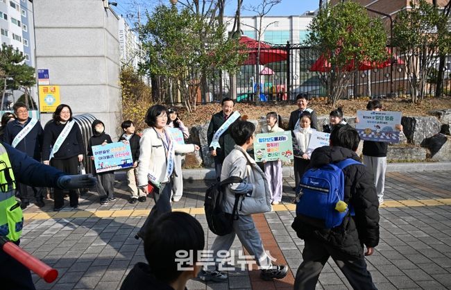 (원투원뉴스) 울산 북구는 19일 개학기를 맞아 명촌초등학교 등굣길에서 '아이 먼저' 교통안전 캠페인을 실시했다.