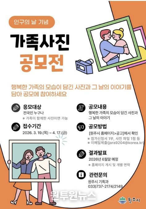 (원투원뉴스) 원주시는 인구의 날을 기념하여 이야기가 있는 가족사진 공모전을 개최한다.