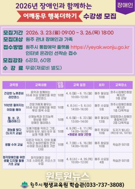 (원투원뉴스) 원주시 평생교육원 학습관은 오는 23일부터 26일까지 장애인과 함께하는 ‘어깨동무 행복 더하기’ 1기 수강생을 모집한다.