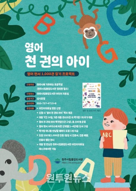 (원투원뉴스) 원주시립중앙도서관은 오는 24일부터 초등 아동을 위한 영어 원서 1,000권 읽기 프로그램인 ‘영어 천 권의 아이’를 운영한다.