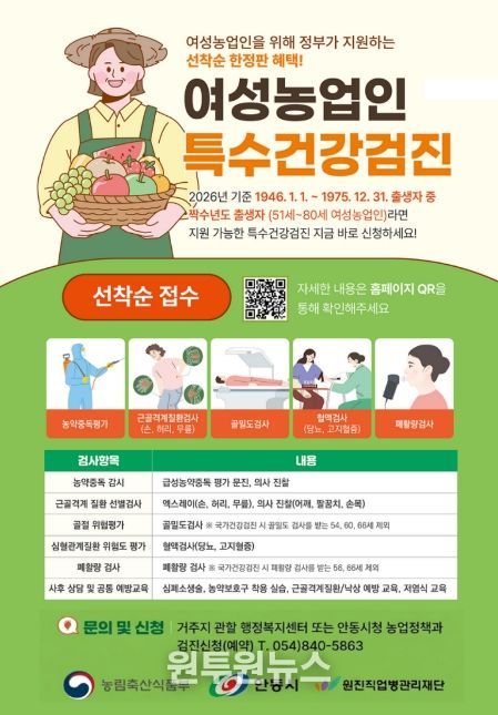 (원투원뉴스) 안동시는 여성농업인의 농작업 질환을 예방하고 전문적인 건강관리를 지원하기 위해 ‘2026년 여성농업인 특수건강검진사업’을 본격 추진한다.