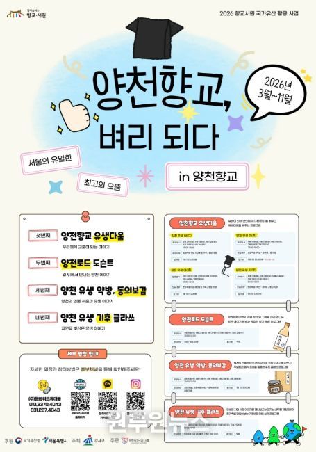 (원투원뉴스) 서울 강서구는 서울 유일의 향교인 양천향교에서 3월부터 11월까지 ‘2026년 향교·서원 국가 유산 활용사업’을 진행한다.