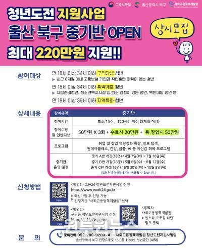 (원투원뉴스) 울산 북구는 구직단념청년의 구직 의욕 향상과 취업 역량 강화를 위한 '청년도전지원사업' 중기반 참가자를 모집한다고 20일 밝혔다.