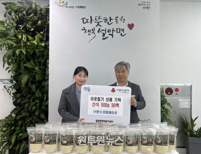 (원투원뉴스) ㈜한수코퍼레이션은 최근 가평군 설악면 행정복지센터를 방문해 관내 취약계층을 위해 선식 500g들이 30팩을 기탁했다.