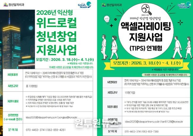 익산시는 '2026년 익산형 위드로컬 청년창업 지원사업'과 '2026년 익산형 청년창업 액셀러레이팅 지원사업(TIPS 연계형)' 참여자를 오는 4월 1일까지 모집한다고 20일 밝혔다.