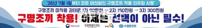 2026년 7월 1일부터 개정된 '어선안전조업법'이 시행됨에 따라, 2인 이하 소규모 어선 승선원의 구명조끼 착용이 의무화된다.