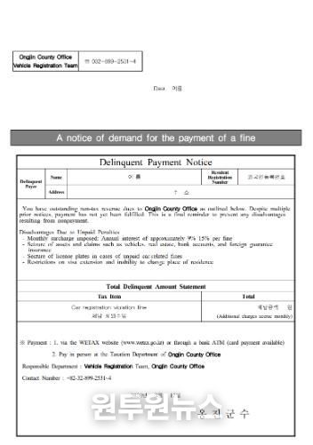 (원투원뉴스) 옹진군이 자동차 과태료 외국인 체납자들을 대상으로, 영어로 번역된‘자동차 과태료 체납 안내문’을 발송한다고 밝혔다.