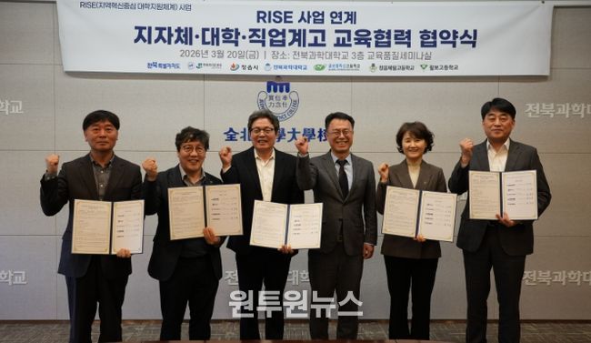 (원투원뉴스) 정읍시는 19일 전북과학대학교 및 관내 직업계고 3곳과 손잡고 지자체와 대학, 고등학교를 하나로 잇는 ‘지역혁신중심 대학지원체계(RISE)’ 교육 협력 업무협약을 체결하며 맞춤형 인재 양성에 본격 나선다.
