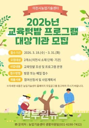 (원투원뉴스) 이천시는 도시농업 기반 조성 및 활성화를 위해 2026년 도시농업 교육텃밭 프로그램 대상자를 3월 31일까지 모집한다고 밝혔다.