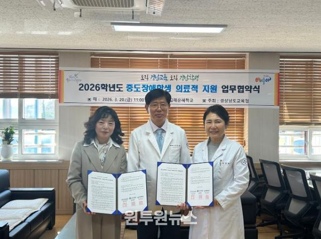 (원투원뉴스) 경상남도교육청은 20일 오전 11시, 김해은혜학교에서 서종요양병원과 중도장애학생을 위한 맞춤형 의료 지원 업무 협약을 체결했다.