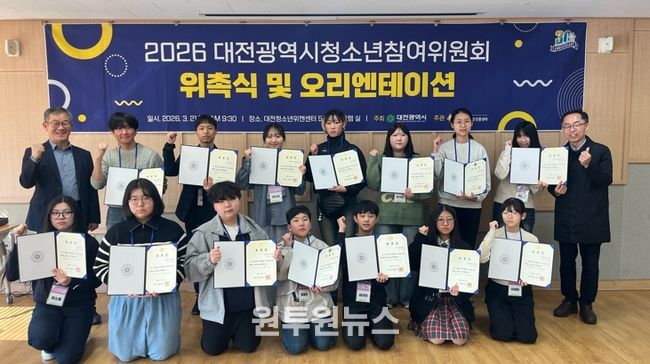 (원투원뉴스) 대전시는 21일 오전 10시 대전청소년위캔센터에서 ‘대전광역시 청소년참여위원회’ 위촉식을 개최하고, 공개모집 및 심사를 통해 선발된 청소년 14명에게 위촉장을 수여했다.