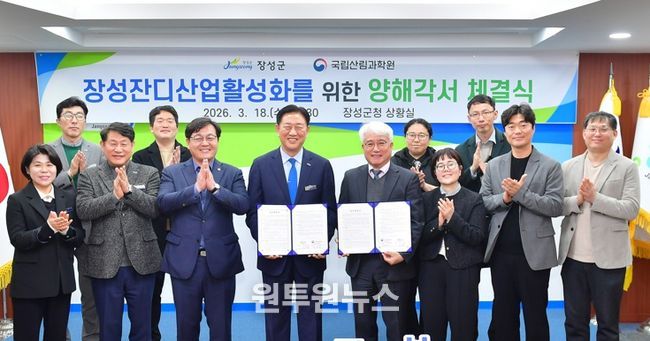 (원투원뉴스) 장성군과 국립산림과학원이 18일 군청 상황실에서 잔디산업 활성화를 위한 업무협약을 체결했다. 협약식에는 김한종 장성군수, 권순덕 국립산림과학원 산림바이오소재연구소연구소장 등 관계자 10여 명이 참석했다.