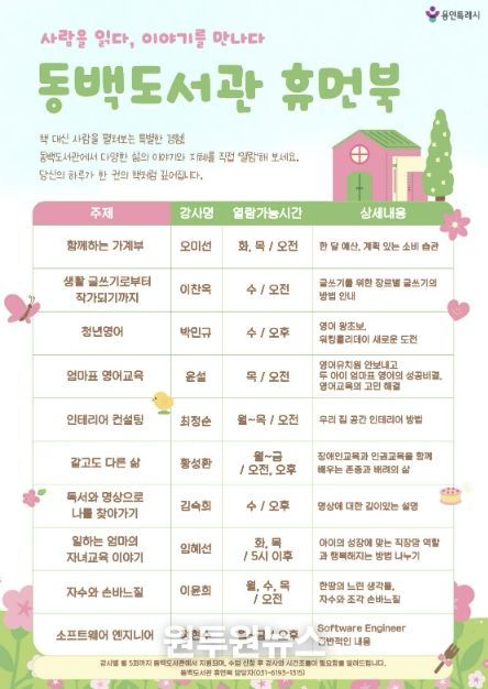 (원투원뉴스) 용인특례시 동백도서관은 오는 4월 1일부터 ‘휴먼북’ 프로그램을 정비해 본격 운영한다고 23일 밝혔다.