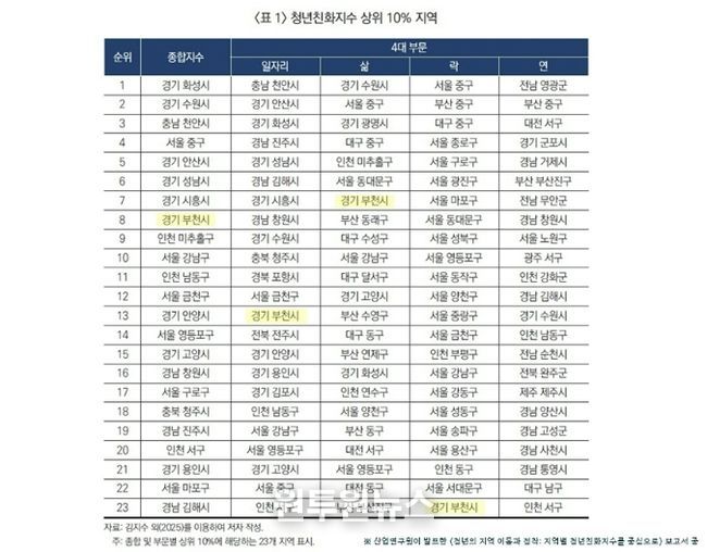 산업연구원은 최근 ‘청년의 지역 이동과 정착: 지역별 청년친화지수를 중심으로’ 보고서를 통해, 전국 229개 시·군·구의 청년 정주 여건을 일자리(Work)-삶(Life)-락(Fun)-연(Engagement) 분야에서 분석한 결과를 발표했다. 부천시는 종합지수 8위, 위 4개 부문 중 3개가 상위 10%에 들며 전반적으로 청년이 살기 좋은 도시로 나타났다.
