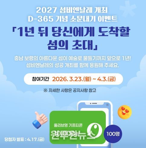 (원투원뉴스) 섬비엔날레조직위원회는 3월 23일부터 오는 4월 3일까지 약 2주간 섬비엔날레 개최 D-365일을 맞아 대국민 온라인 참여 이벤트를 진행한다고 밝혔다.