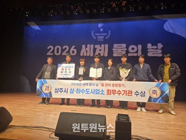 (원투원뉴스) 상주시 상수도사업소, 하수도사업소는 3월 20일 경북도 주관하에 구미시 강동문화복지회관에서 개최된 '2026년 세계 물의 날 기념식'에서 상하수도 업무 추진에 기여한 공로를 인정받아 기관 표창을 수상했다.