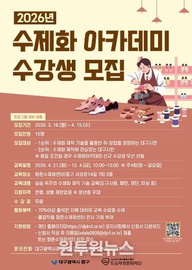 (원투원뉴스) 대구 중구는 오는 4월 15일까지 수제화 산업 전문 인력 양성을 위한 ‘2026년 수제화 아카데미’ 수강생을 모집한다.