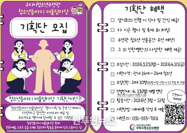 (원투원뉴스) 구리시청소년재단 청소년수련관은 지역 청소년들이 축제 기획의 주체로 참여해 역량을 키울 수 있는 ‘2026 청소년동아리 어울림마당 기획단’을 오는 3월 23일부터 4월 10일까지 모집한다.