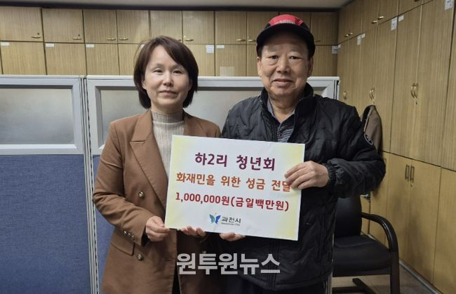 (원투원뉴스) 과천시 과천동 하2리 청년회는 최근 화재로 거주지를 잃고 이재민 보호시설에 임시 거주 중인 이 모 씨(63세) 가구에 긴급 지원금 100만 원을 지난 18일 전달했다.