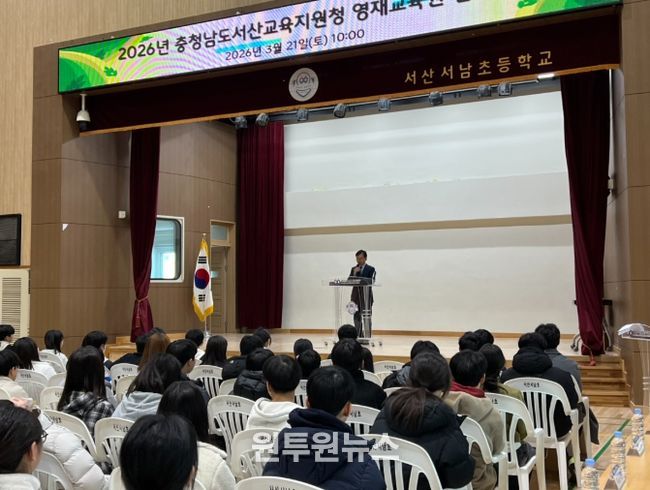 (원투원뉴스) 충청남도서산교육지원청은 3월 21일 서산서남초등학교 체육관에서 2026학년도 제24기 서산교육지원청영재교육원 입학식을 개최했다. 이날 입학식에서는 서산인재육성재단이 장학금 2천만 원을 기탁하며 지역 인재 양성에 힘을 보탰다.